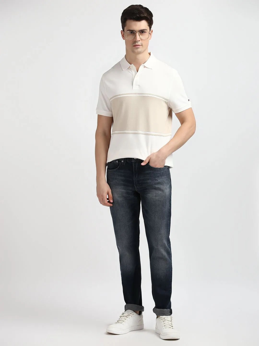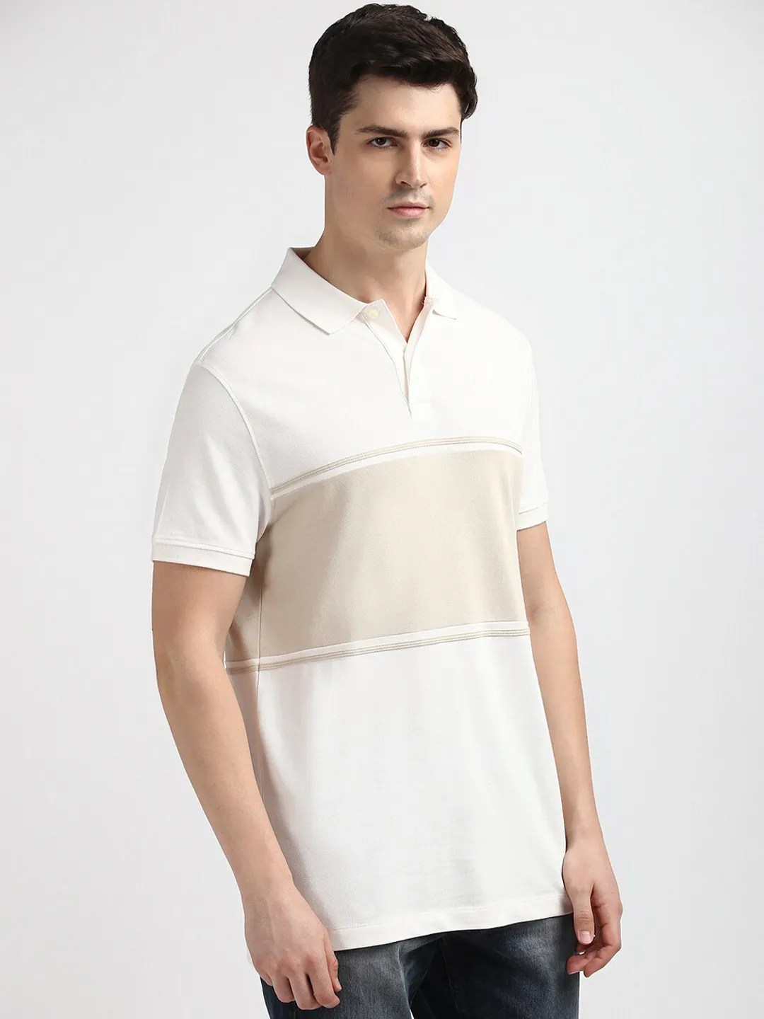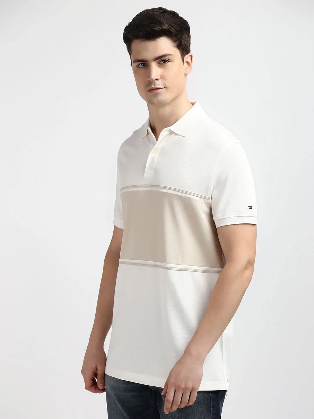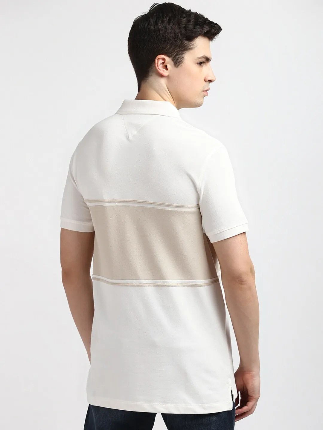 • Regular length with a striped polo collar.