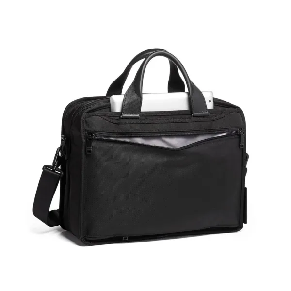 Stay organized and travel in style with this TUMI Black Laptop Case. Designed for 15” laptops, it features multiple compartments, a removable padded shoulder strap, and TUMI Tracer for security. Durable, sleek, and backed by a 5-year warranty.